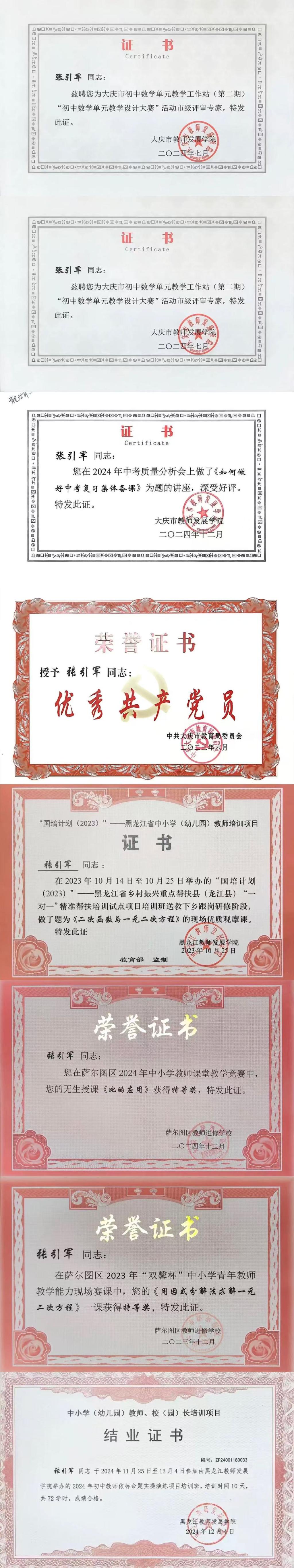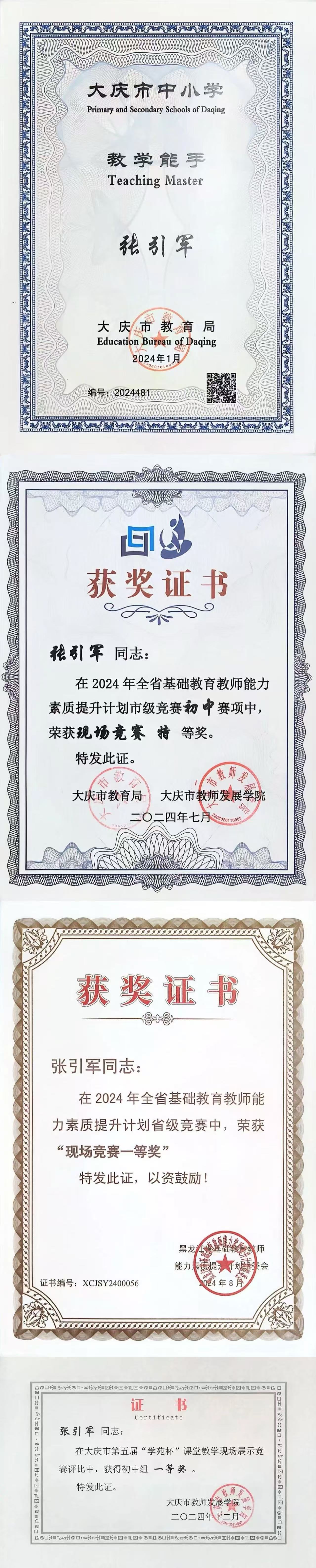 多年的深耕与积淀,让张引军在教学与科研领域硕果累累,成为大庆教育界冉冉升起的“骨干力量”。在教学竞赛中,他凭借精湛的课堂设计与深厚的专业功底屡获殊荣:2024年,他在全省基础教育教师能力素养提升竞赛中斩获现场课一等奖,同年在该赛事市级竞赛初中赛项中摘得现场课特等奖,还在大庆市第五届“学苑杯”课堂教学现场展示竞赛中获初中组一等奖,三项重量级奖项的背后,是他对“高效课堂”的反复打磨,对“以生为本”理念的深度践行;2023年,他不仅获评大庆市十百千“教学能手”,还受邀呈现国培计划省级送教下乡现场优质观摩课,将自己的教学经验辐射至更广阔的教育领域。