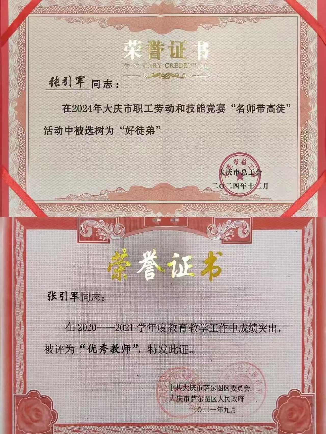 而在个人品德与团队协作中,张引军的表现同样亮眼:2023年,他因坚定的理想信念与突出的工作表现,被评为大庆市优秀共产党员;2021年,他获评萨尔图区“优秀教师”,成为区域教育的先进典范;2024年,在大庆市职工劳动和技能竞赛“名师带高徒”活动中,他被选树为“好徒弟”,展现出谦逊好学、积极进取的专业态度。