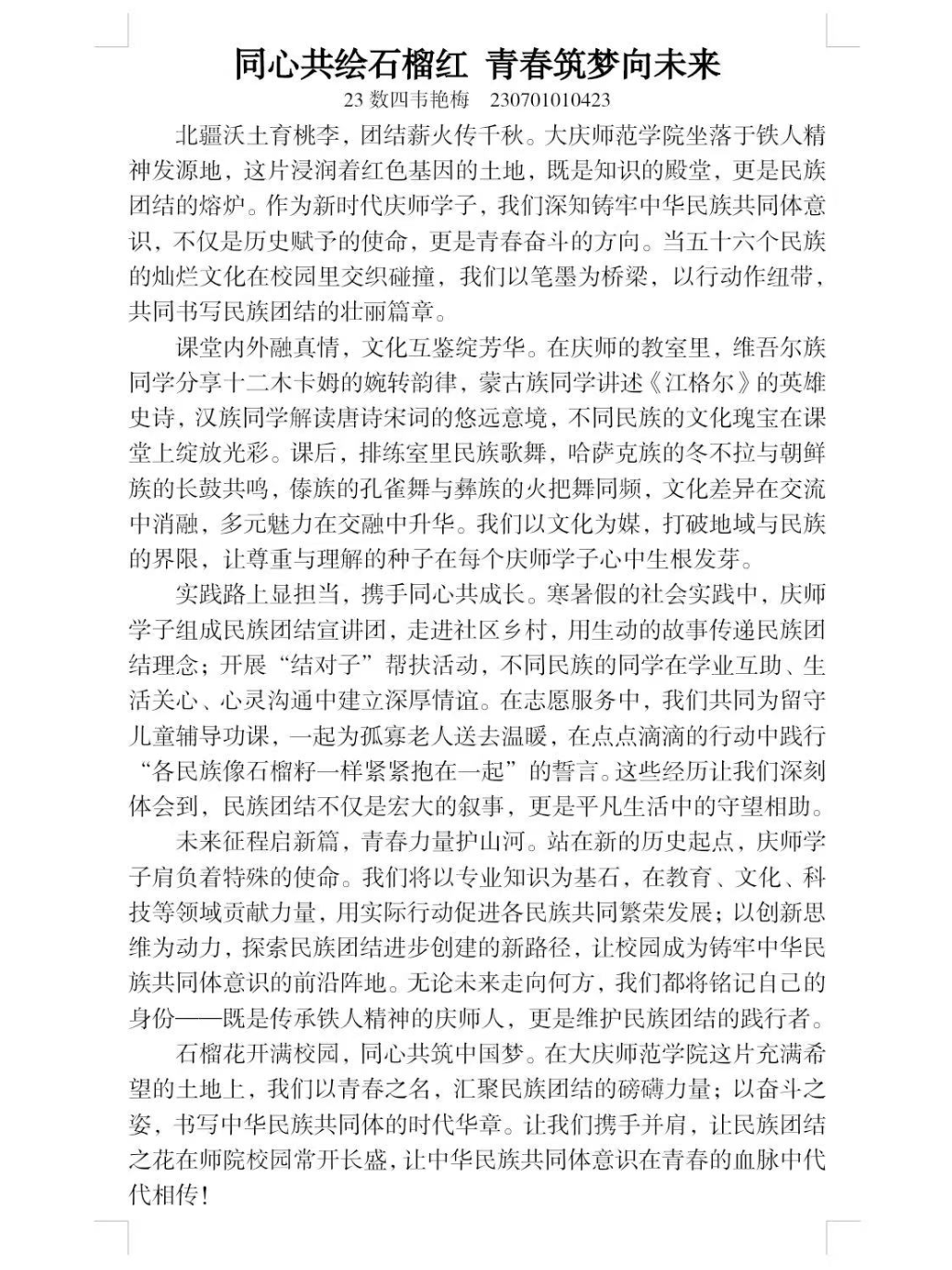 活动启动后,学院鼓励师生结合自身经历挖掘素材,通过年级通知、班级动员等形式宣传。我院教师以教学中民族文化交融案例撰写议论文,阐释民族团结意义;学生则聚焦校园民族团结场景,用散文、记叙文记录经历感悟。经学院多轮筛选,最终确定《石榴花开满校园》《同心筑梦,共话团结》等四篇优质作品,现进行集中展示,让我们透过这些文字,读懂民族团结的深厚内涵,汲取携手共进的精神力量。