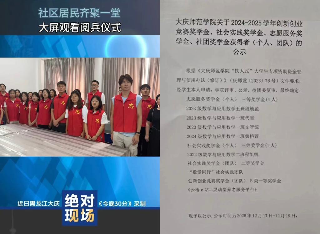 学院将志愿服务融入育人底色,培养学生社会责任感。学院累计组织开展志愿服务活动40余场,荣获志愿服务、社会实践类个人三等奖及社会实践团队二等奖等多项荣誉;联合特殊教育学校与社区常态化开展关爱自闭症儿童、关爱老人等暖心行动。其中“社区居民齐聚一堂 大屏观看阅兵仪式”特色活动,被大庆电视台《今晚30分》《绝对现场》栏目专题报道,社会反响良好;“籽籽相拥,数爱同行”暑期“三下乡”社会实践团获评校级“优秀团队”,相关事迹被《中青校园》网报道;2023级周继儒开展亚冬会闭幕式志愿者事迹宣讲会,以实际行动践行青春担当,有效强化学生理想信念与社会责任意识。