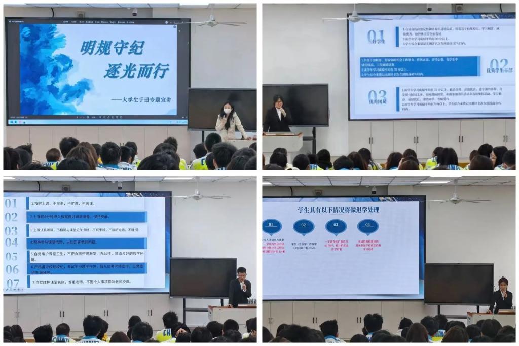 学院从学生成长需求与数理学科育人特色出发,不断提升学生日常管理精细化水平,推动服务工作见行见效。通过参加创意寝室、标兵寝室等特色评选活动,丰富宿舍文化生活内涵;开展多场大学生手册讲解系列活动,采用“师生搭档主讲+沉浸式体验”模式,打造兼具师范特色与育人实效的解读课堂,切实提升学生规则意识与综合素养。
