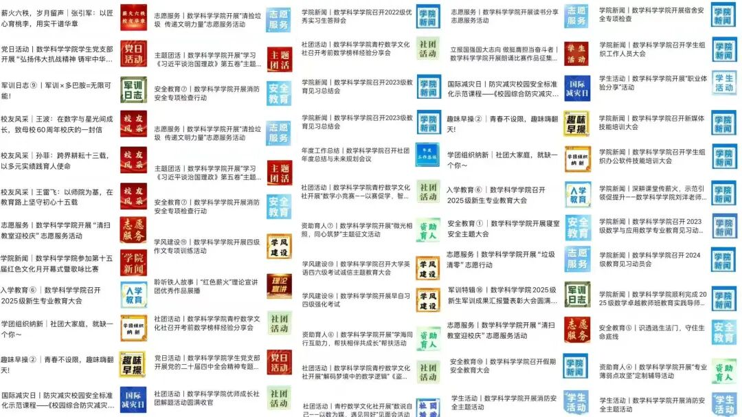 学院推进新媒体建设,提升宣传力度,深耕“Math数你最美”公众号、学院官网等线上渠道。公众号下设“千亿国际平台新闻”“学生活动”等十五大板块,官网开设“党群工作”“招生就业”等十大专题;2025年累计发布推文575篇、官网新闻610篇,推出主题视频68个,总阅读量达191326次,单篇最高阅读量突破1714次。其间开设多次拍摄及写作技巧培训,提升学生干部实操水平。同年,优秀作品《当数学专业撞上强国历史,简直是“数”出不穷的热血剧本》在第八届大学生网络文化节(学生组)—网语青年说(网络文章)中成功入围国赛,全方位展现数科学子的风采。