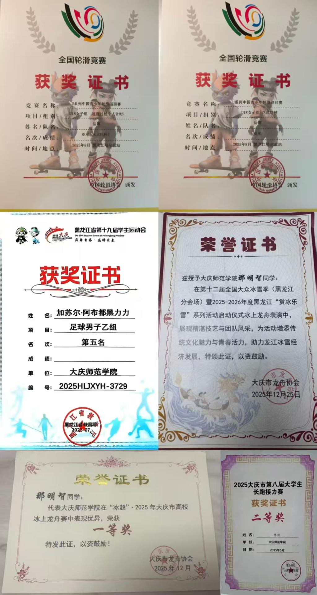 以学生体魄与素养双提升为重点,学院持续拓展艺体实践育人平台,在各类赛事与特色活动中亮点频现。在国家级赛事中,我院学子在U系列中国青少年轮滑巡回赛(黑龙江哈尔滨站)U18女子组花式绕桩、速度过桩个人计时两个项目中均斩获亚军。在省级赛事中,“学运会”足球赛取得优异名次。在市级赛事中,“冰超”·2025年大庆市高校冰上龙舟赛荣获一等奖,并在第十二届全国大众冰雪季(黑龙江分会场)暨2025-2026年度黑龙江“赏冰乐雪”系列活动启动仪式上的冰上龙舟表演中展现精湛技艺与团队风采;第八届长跑接力赛喜获二等奖。在校级赛事中,第四十届运动会上不仅荣获“最佳组织奖”,更在短跑、跳远等单项赛事中收获3项第一名、5项第二名及十余项各级荣誉;排球、篮球团体赛分别荣获第三名、第六名。此外,学院精心策划主办“荧光夜跑”等多元特色活动,以丰富的艺体实践载体赋能学生身心健康与综合素质全面提升。
