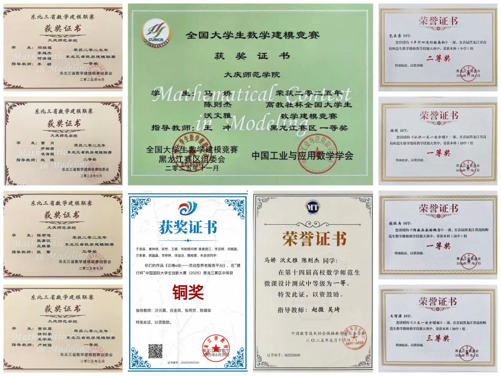 学院围绕高素质应用型人才培养方向,以学科竞赛为纽带,组织学子参与各级各类学科竞赛,捷报频传。累计斩获省级以上奖项68项,其中7名学生荣获“建行杯”中国国际大学生创新大赛黑龙江赛区省级铜奖,61名学生在全国大学生数学建模竞赛、东北三省数学建模联赛等权威赛事中脱颖而出;在首届黑龙江省高校学生数学教学技能大赛中,表现尤为突出,数学微格教学技能比赛获奖率达100%,数学微课设计大赛斩获奖项十余项,充分彰显我院学子扎实的专业功底与实践能力。