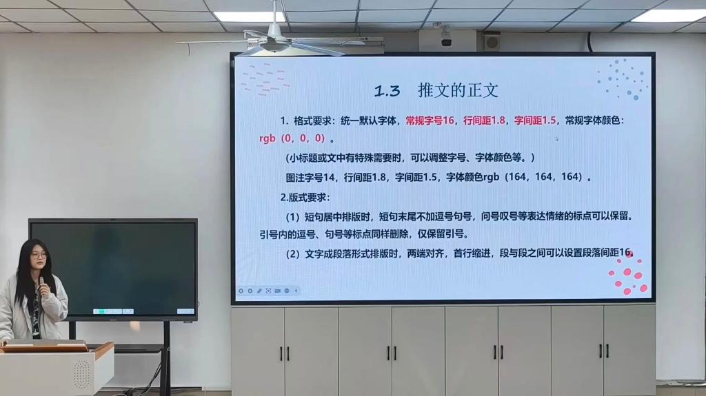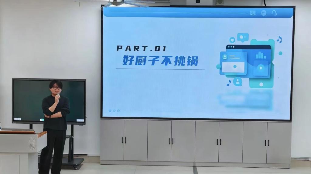 培训以编辑、影音为两大核心模块有序开展。在编辑专题环节,周亚祺结合校园微信公众号运营实例,从选题策划、标题拟定、排版逻辑到文案撰写进行系统讲解,并通过秀米、135编辑器等工具的实操方法,直观解答日常排版中的各类常见问题。在影音专题环节,刘硕德聚焦拍摄构图和视频剪辑展开教学,重点围绕构图干净、曝光正常、线条平直三大要点,拆解摄影构图的基础原理与实操技巧。培训现场互动频繁、氛围热烈,参训成员认真聆听、积极交流。同学们纷纷表示此次培训内容翔实、实用性极强,既有效解决了日常宣传工作中的诸多困惑,也进一步激发了新媒体创作的热情与灵感。