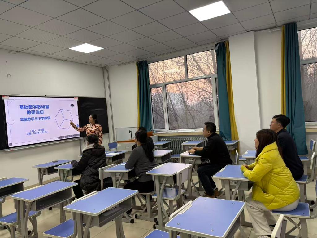 2025年11月19日,基础数学教研室“离散数学与中学数学”主题开展教研活动,副院长沙元霞担任主讲。