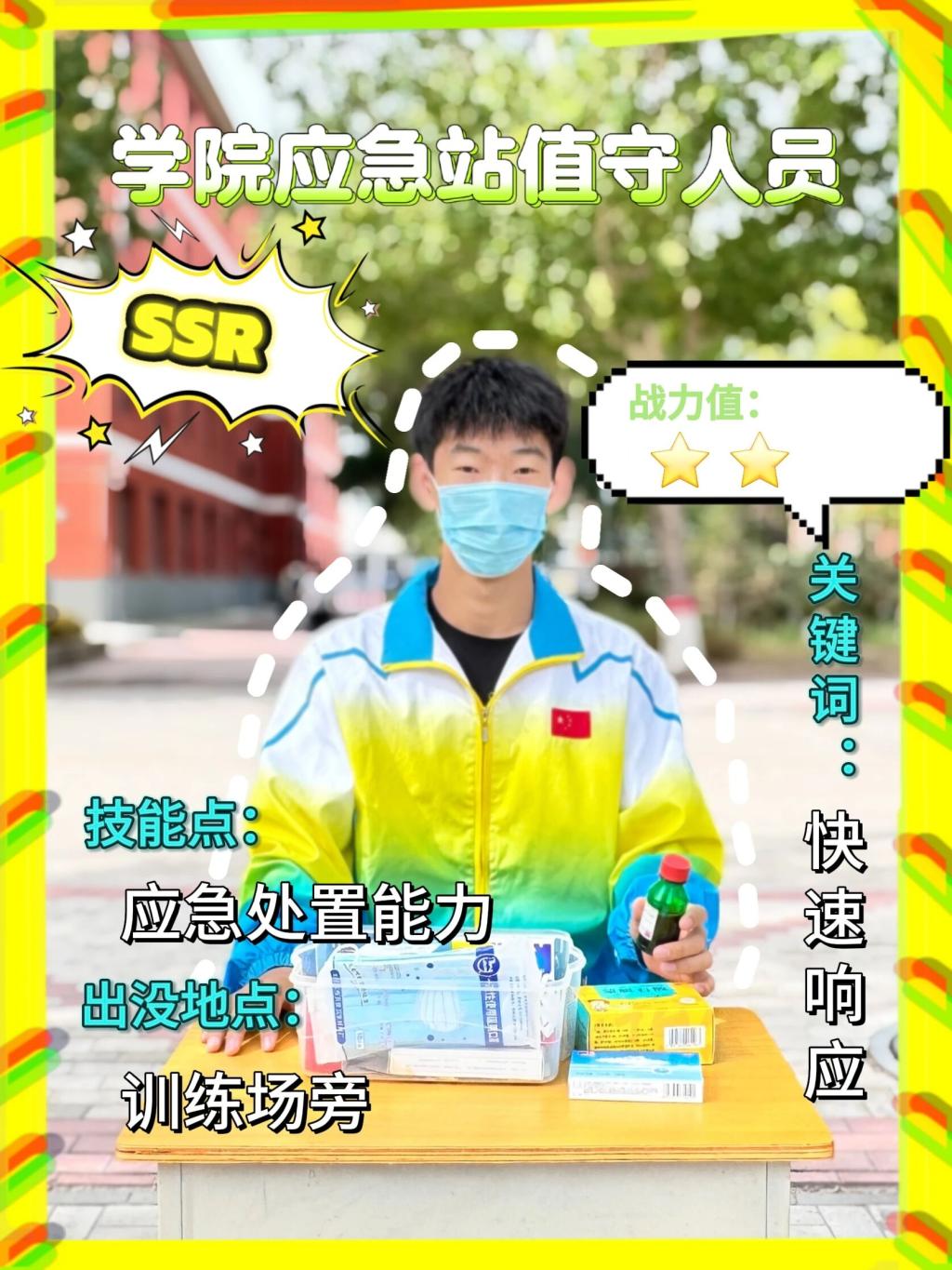 “学院应急站值守人员”是军训场的“药品补给员”,细心又及时,面对身体不适需求快速响应。
