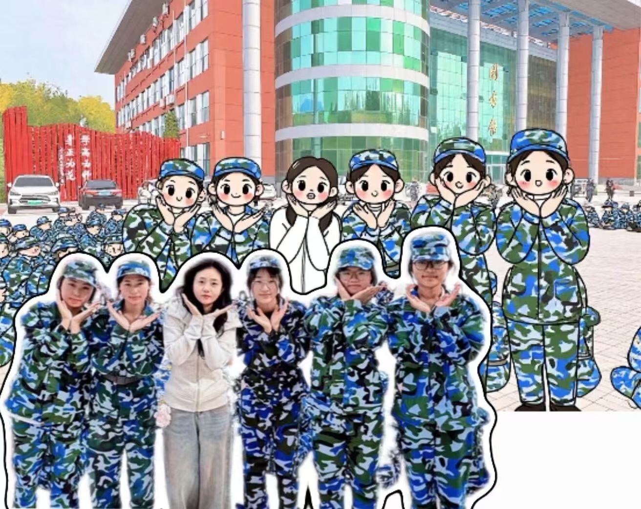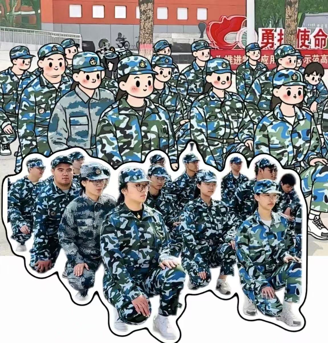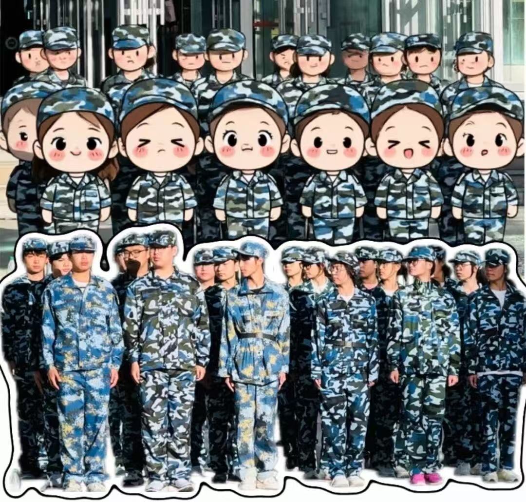 看这张集体照,现实里大家整齐列队超有气势,Q版里一个个圆脑袋、肉脸蛋,迷彩服都变得软fufu,像一群小士兵玩偶,把训练场的严肃感全换成治愈感~