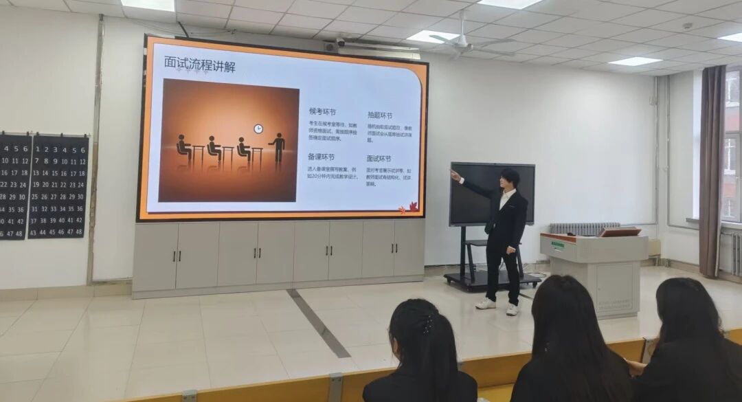 活动伊始,学院开设3小时专项指导,主讲人系统讲解教资面试全流程,帮助学生精准把握各环节核心要点与实操策略。候考阶段,重点指导入场核验规范流程,并开展考前心态调适辅导;抽题备课环节,细化解析十分钟备课的时间分配逻辑与教学设计框架;面试核心环节,深入剖析结构化答题、试讲演示及答辩的实战技巧;收尾阶段,明确退场礼仪规范,并讲解突发情况的应急处置方案。同学们反馈,本次活动帮助其更好地了解教资面试评分细则,有效提升临场应变与实战应试能力。