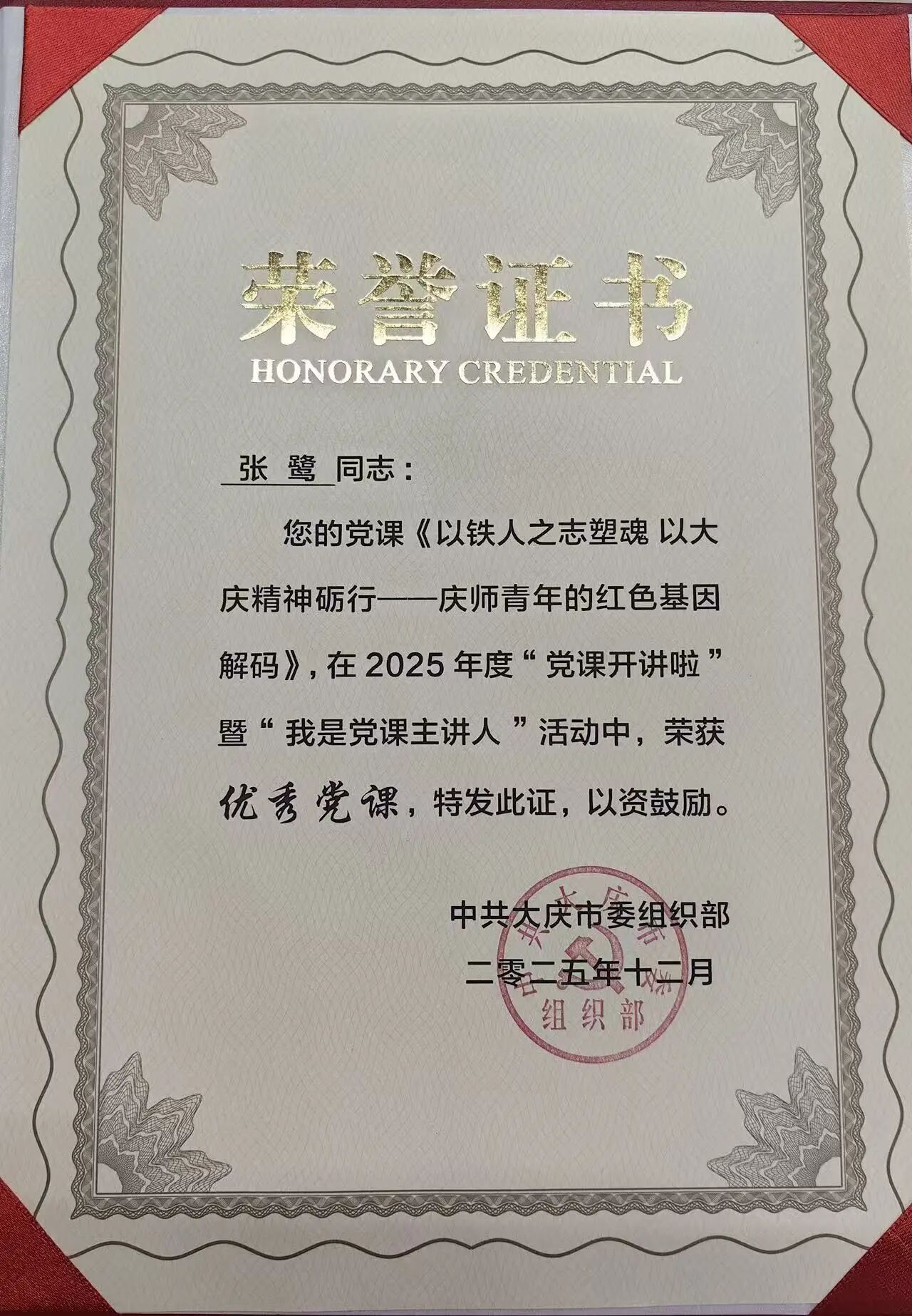 近日,从中共大庆市委组织部传来喜讯,我院辅导员张鹭老师主讲的党课《以铁人之志塑魂 以大庆精神砺行——庆师青年的红色基因解码》,在2025年度“党课开讲啦”暨“我是党课主讲人”活动中,凭借深刻的思想内涵、生动的叙事表达和强烈的青年共鸣,荣获“优秀党课”荣誉称号。这份沉甸甸的证书,是对张鹭老师深耕思政教育、创新党课形式的高度认可,也为我院党务工作再添亮丽一笔。