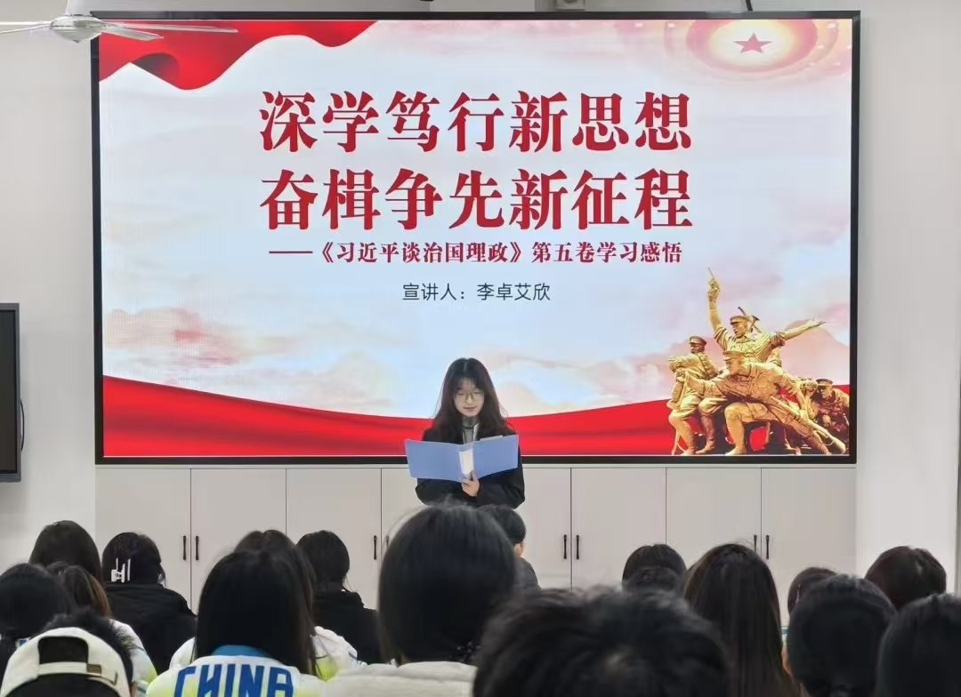 活动伊始,主持人介绍学习活动背景意义,强调要学深悟透《习近平谈治国理政》第五卷对青年的重要价值。随后四位宣讲人系统阐释核心要义与实践要求,聚焦“两个结合”、中国式现代化、“人民至上”、“新质生产力”等关键内容。最后两位同学分享了她们的读书心得,阐释了成长之道,并点亮了前行征程。同学们深刻认识到,《习近平谈治国理政》第五卷作为奋进新征程的强大思想武器,系统展现了马克思主义中国化时代化的最新成果。并且纷纷表示将以此次学习为起点,坚持读原著、学原文、悟原理,把理论学习成果转化为学习钻研的动力,服务社会的担当。